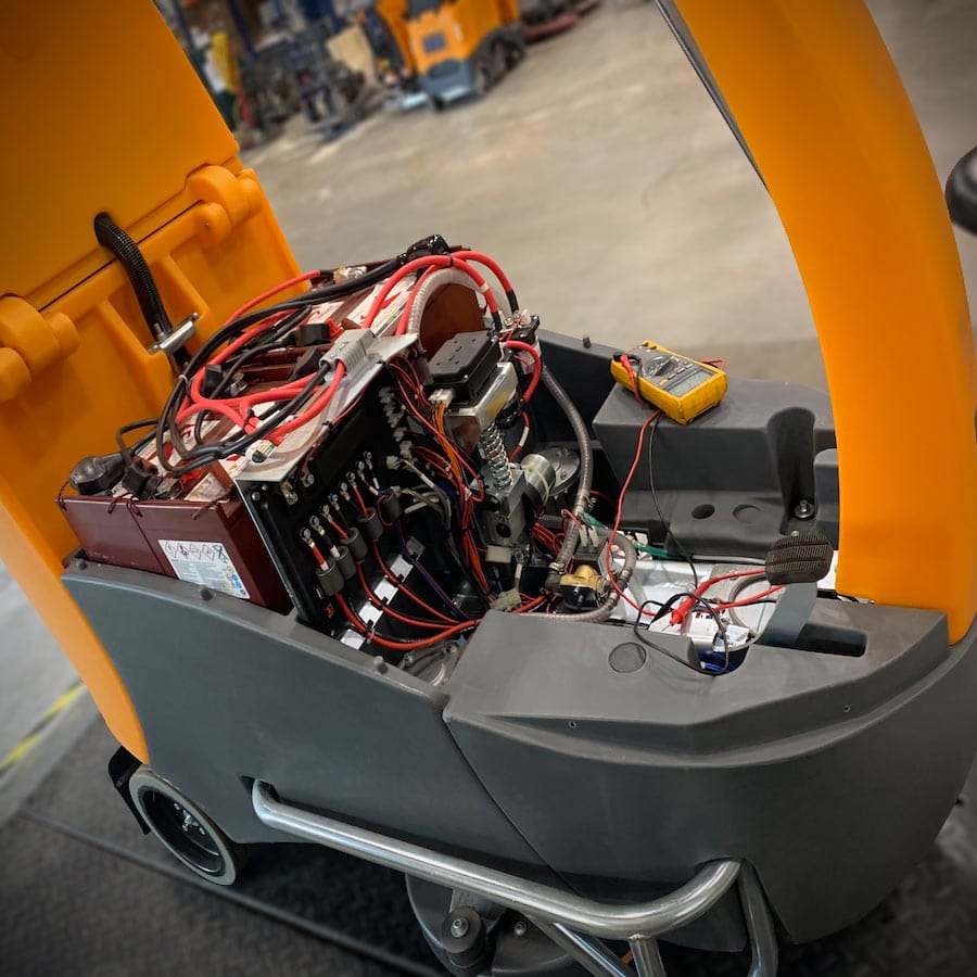We service key systems including drive motors, vac motors, pumps, squeegee assemblies, batteries, chargers, wiring, and control boards.